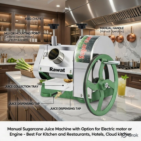 The Rawat Manual Sugarcane Juice Machine is a robust, hand-operated juicer designed for maximum juice extraction with minimal effort. Crafted from high-quality stainless steel, it ensures hygiene, durability, and easy cleaning—making it ideal for juice stalls, small shops, and events.