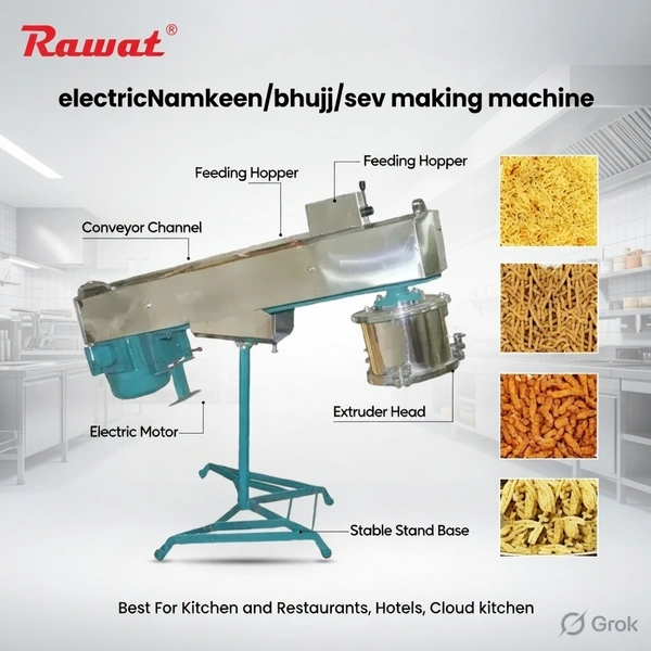 The Rawat Namkeen Making Machine is a robust, fully stainless steel extruder designed for efficient and hygienic production of traditional Indian namkeen, bhujia, sev, ganthia, papadi, fulvadi, chips, and other farsan varieties. Featuring a powerful 1 HP motor and multiple interchangeable sieves, this machine delivers consistent shapes, textures, and high output, making it perfect for commercial snack manufacturers, food processing units, and medium to large-scale namkeen businesses.