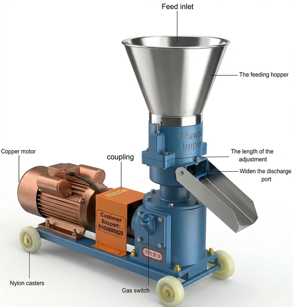 Rawat Impex's Pellet Machine efficiently produces high-quality feed for poultry, dairy, horses, pigs, sheep, and other livestock. This horizontal-type feed pellet machine suits small to medium-scale farms and commercial operations.