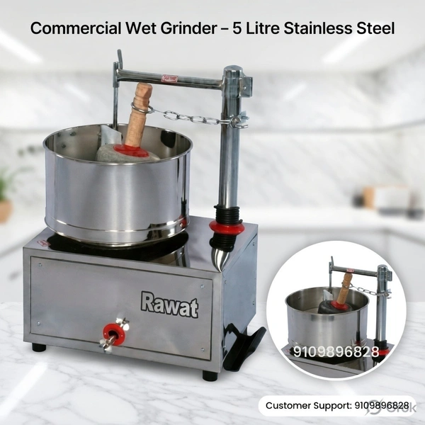 The Rawat SS Commercial Wet Grinder is a durable, high-quality commercial-grade machine designed for efficient wet grinding of soaked grains, dals, rice, coconut, and other ingredients to prepare smooth, fine batters perfect for idlis, dosas, vadas, chutneys, and traditional Indian dishes. Crafted with a robust stainless steel body and precision-engineered grinding stones, this grinder (motorless model) pairs seamlessly with a 0.5 HP motor to deliver consistent performance in restaurants, hotels, catering services, cloud kitchens, and medium-scale food processing units.